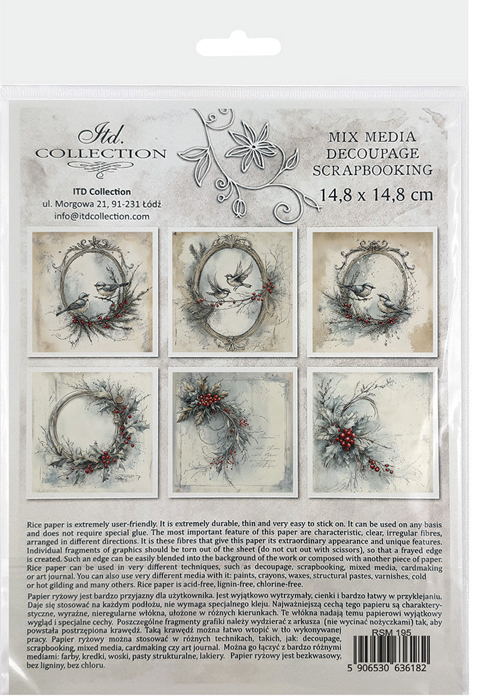 The set of versatile rice papers which could be used in any kind of creative work such as decoupage, scrapbooking, mixed media, cardmaking and art journal.
